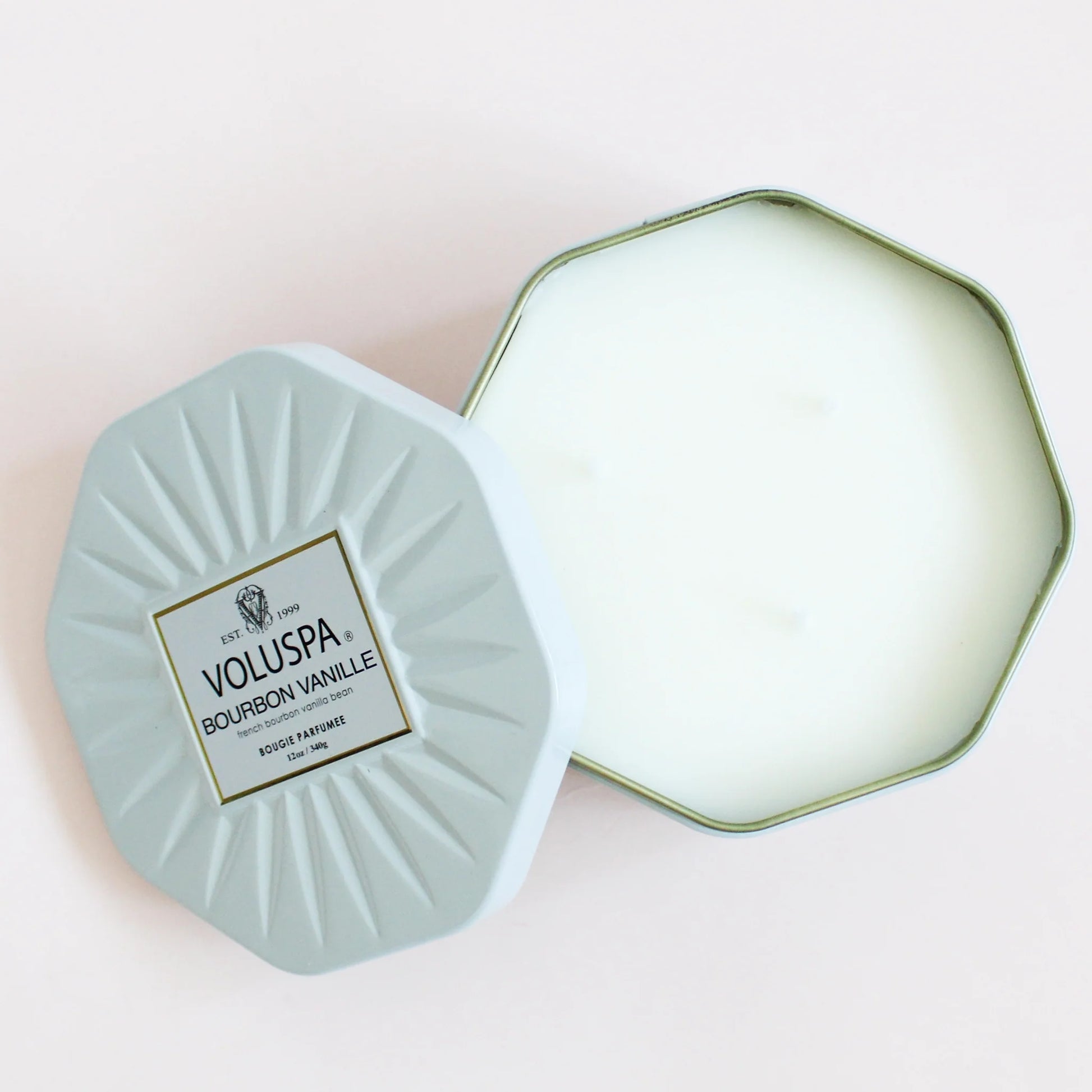 This beautiful, 3 wick octagonal tin candle adds elegance to any room. Complete with matching lid, the luxe gold interior provides a subtle yet decisive flair, a nod to the 1920's glass that inspired it.