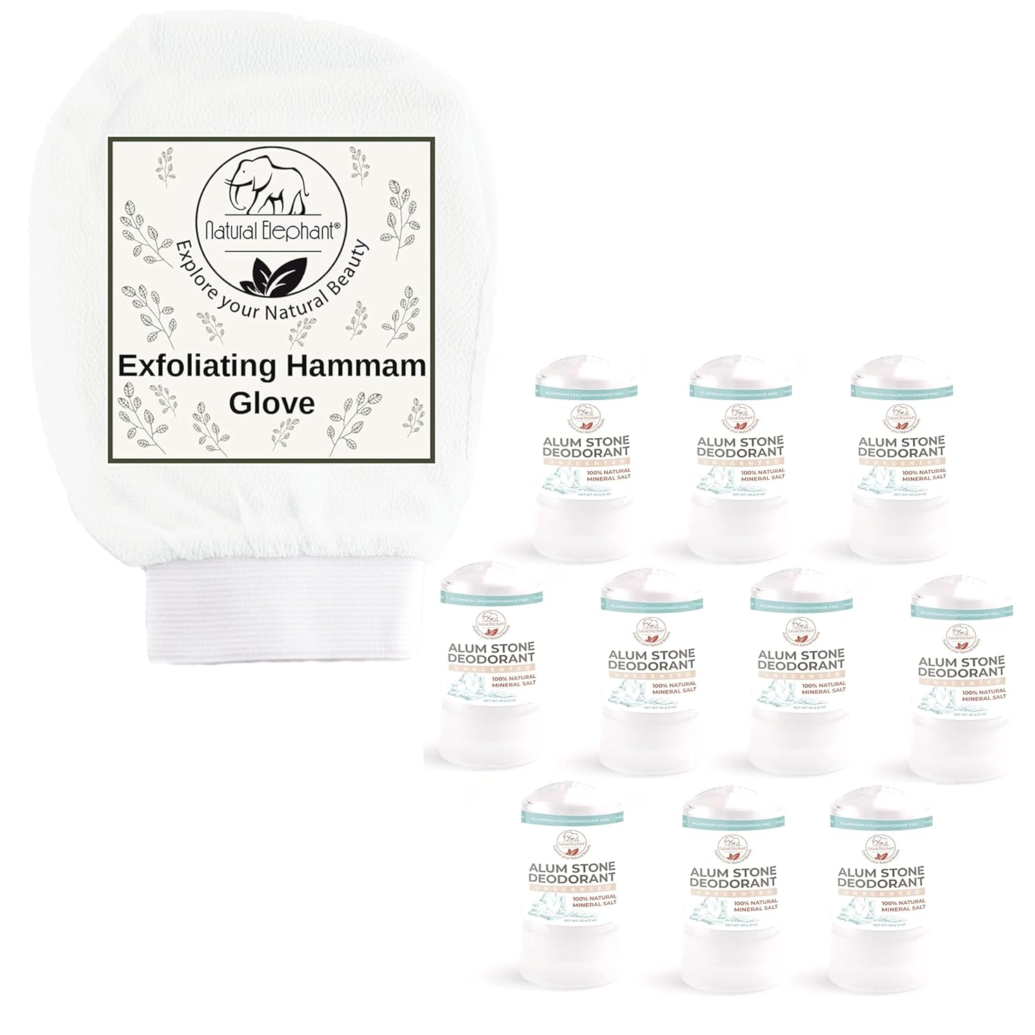 Fresh Skin Duo: Natural Elephant Alum Stone Deodorant Stick & Exfoliating Hammam Glove Pearl White