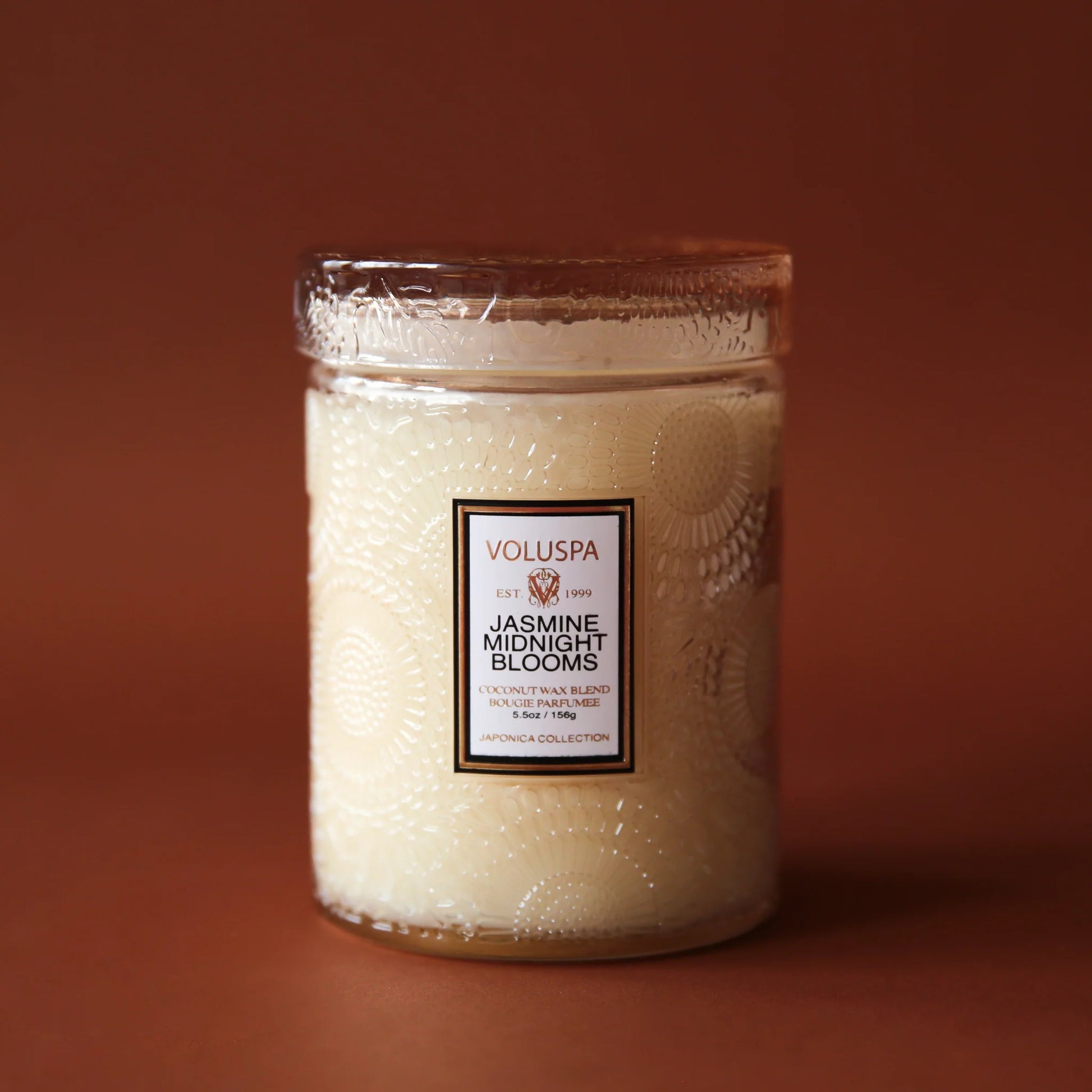 Voluspa's Jasmine Midnight features their unique coconut wax blend is hand-poured into a 5.5 oz. glass embossed vessel and is topped with a matching lid that keeps the candle dust-free when not in use. The single wick allows you to enjoy fragrance throw for 50 hours. Voluspa candles are hand-poured in the United States and feature their proprietary, clean-burning coconut wax blend and 100% natural wicks. Their products are free of phthalates, pesticides, parabens and sulfates and are never tested on animals. Up-cycle this best seller into a keepsake after the last burn.