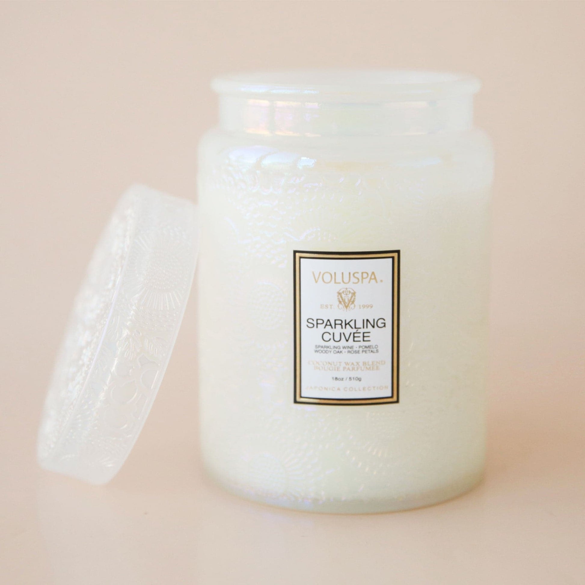 Pop a bottle of Voluspa’s finest blend, it’s time to celebrate! A mix of beautiful aromatic complexity, Sparkling Cuvée opens with vivacious fruit tones of Sparkling Wine, Pomelo and Red Currant. The effervescence of Sparkling Wine is the heart of the celebration, with bubbles cascading to the surface, dancing and mingling with juicy Nectarine and Bulgarian Rose Petals. A velvety, smooth finish of Woody Oak serves as the perfect stage for this aromatic affair. Raise a glass of Sparkling Cuvée, your olfactory aperitif for every unforgettable occasion.