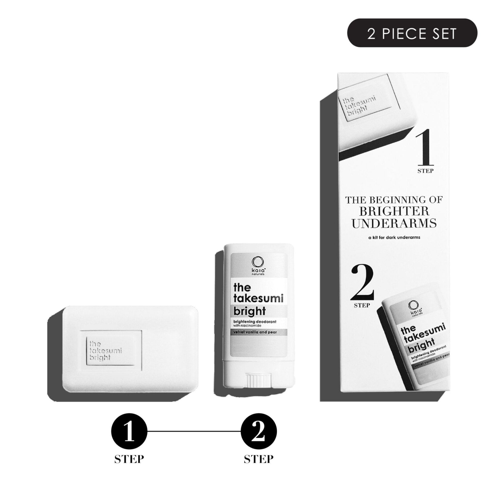 Stay bright and fresh with the Kaia Bright Starter Kit. A travel-friendly effective 2-step underarm brightening system, each product helps to lighten dark spots and pigmentation from scarring or sun damage. The underarm bar removes bacteria and brightens pigmentation with kojic acid. Follow this step with the brightening deodorant to keep your armpits feeling fresh all day. This kit is ideal size for on the go whether your travelling or for your gym/work bag.